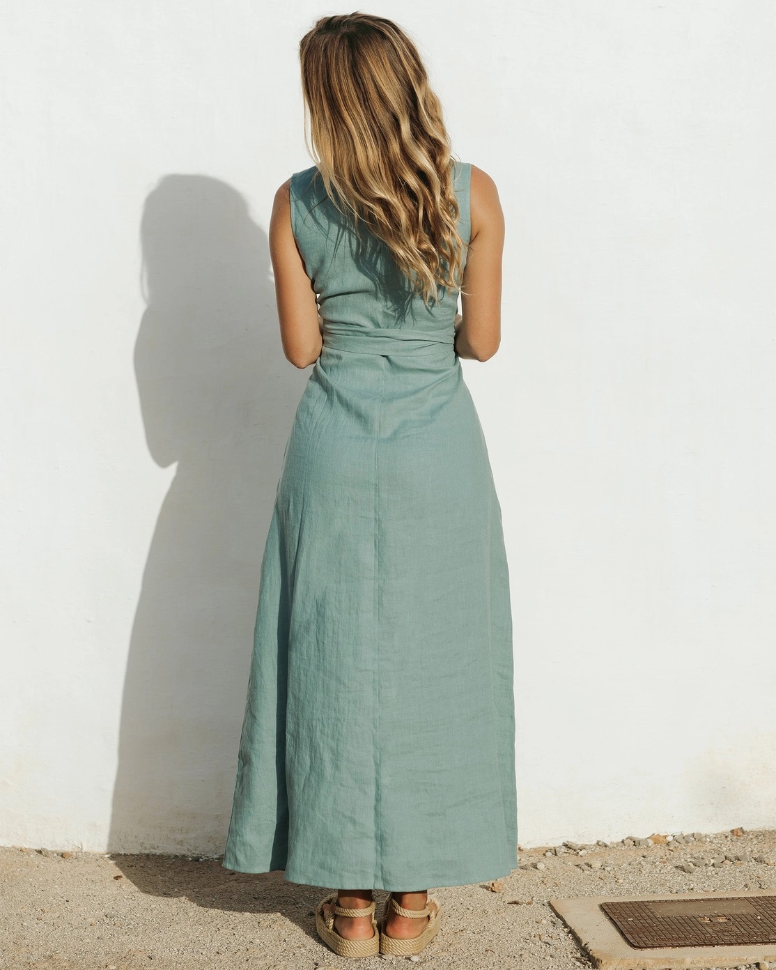 En klänning – många sätt att bära den på. Maxiklänningen i linne BORACAY i tealblå uppmuntrar till experimenterande.
