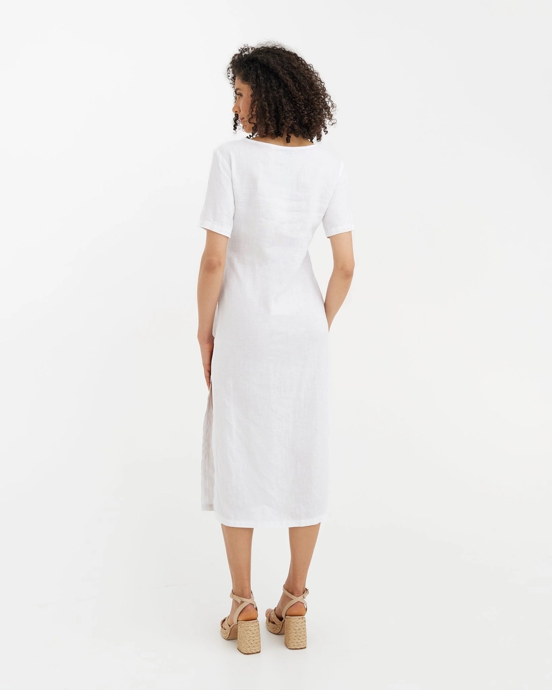 Vita linneklänningen MIAMI med knyt i midjan är en midiklänning för kvinnor tillverkad av 100 % europeiskt linne i ett luftigt, medeltjockt material. Den raka silhuetten har rund halsringning, korta ärmar, knyt i sidan och en sidosprund för rörelsefrihet. Det justerbara midjebandet ger möjlighet att forma midjan utan en fast insvängd konstruktion.