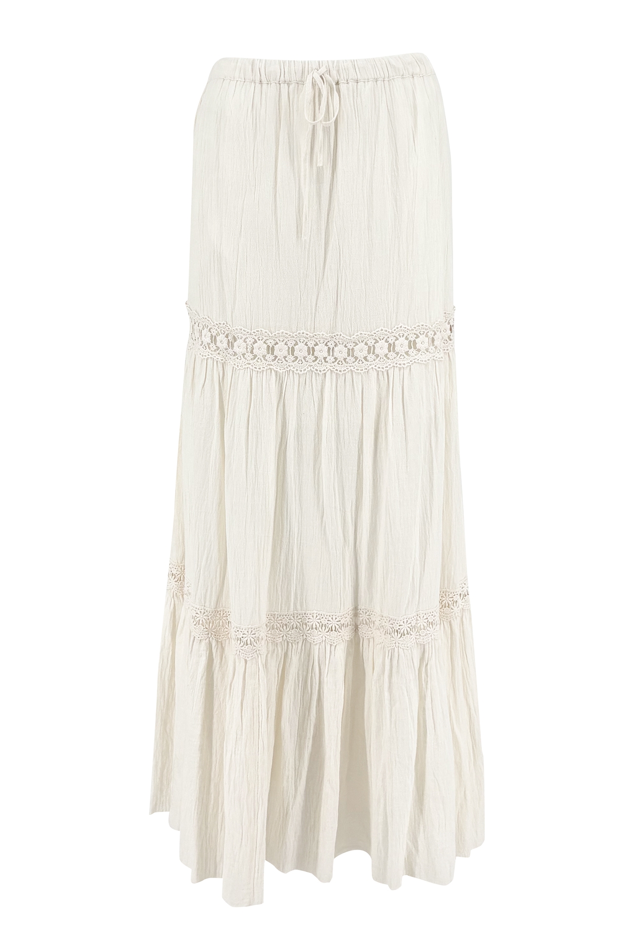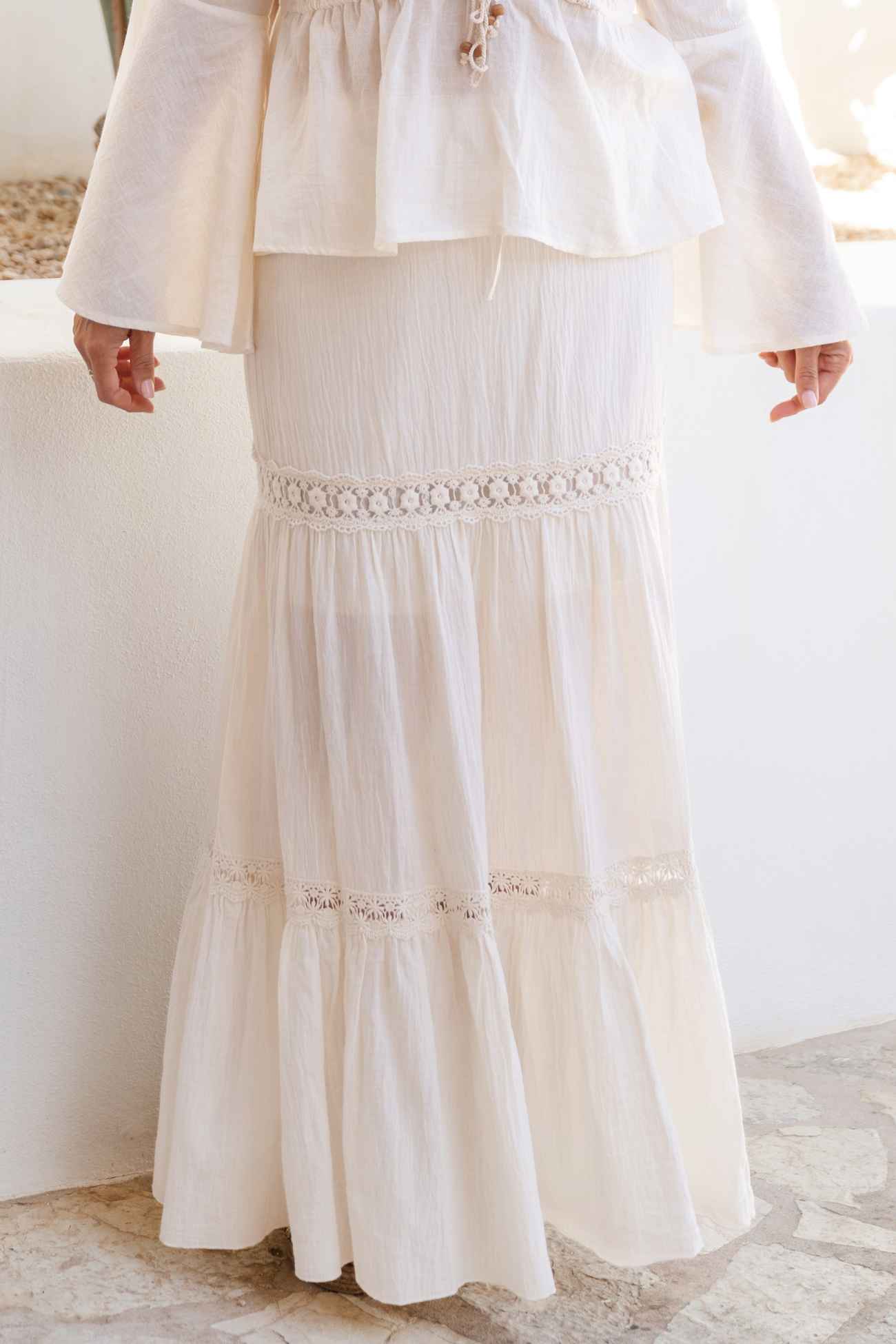 Kjolen faller smidigt längs kroppen och rör sig lätt med dig. Designen innehåller rika spetsdetaljer som ger kjolen ett romantiskt bohemiskt utseende. Midjan sitter bekvämt utan att klämma, så du kan ha kjolen på dig hela dagen. Det är precis dessa handgjorda detaljer och naturliga material.