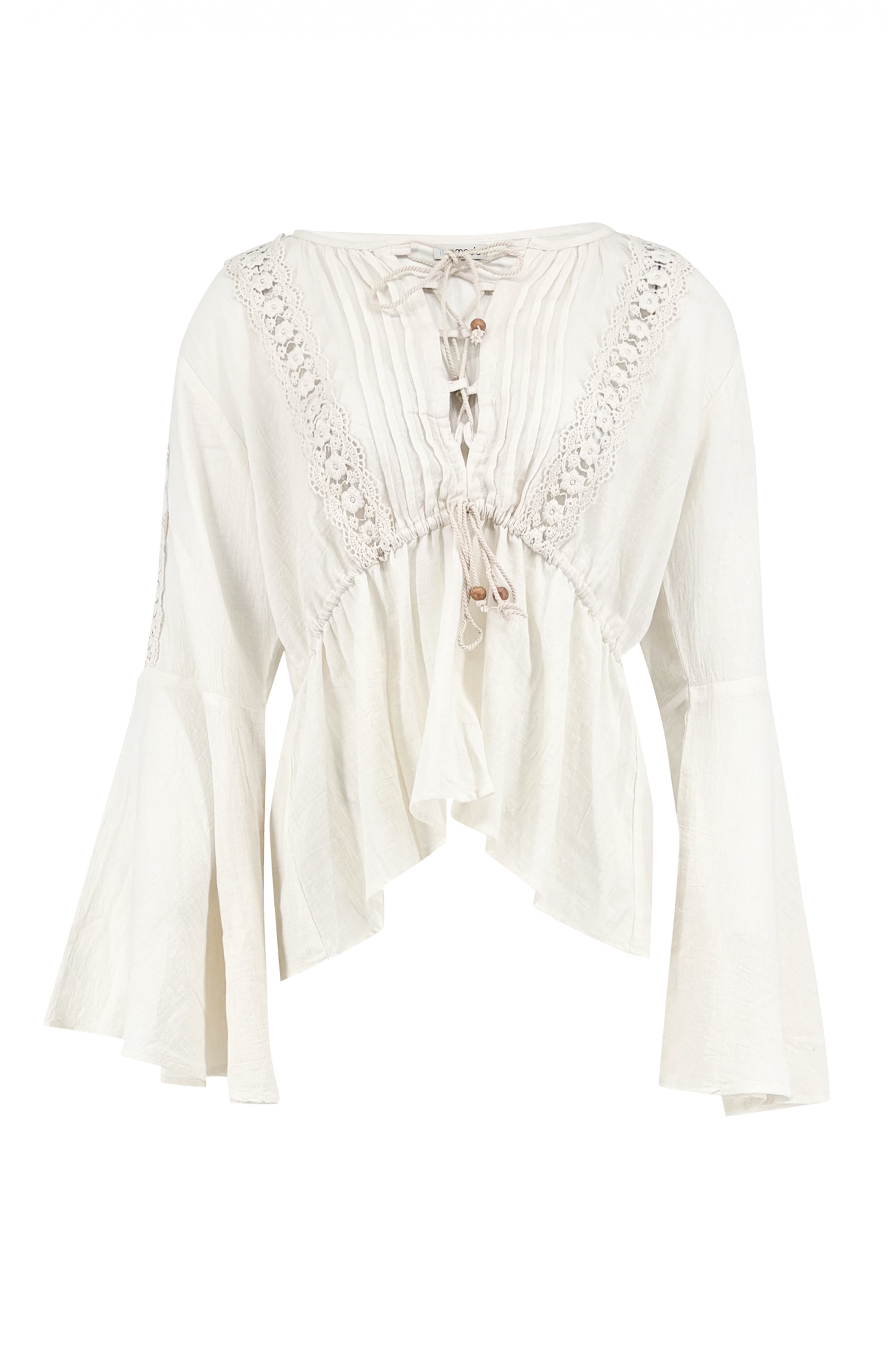 Designens verkliga blickfång är framsidans vackra tråckdetaljer som skapar en smickrande V-form. Justera passformen efter din stil – bär den lite tajtare för en mer markerad silhuett eller lösare för en avslappnad känsla. De utsvängda ärmarna, rikt dekorerade med spets, förstärker den feminina och genuint bohemiska looken.