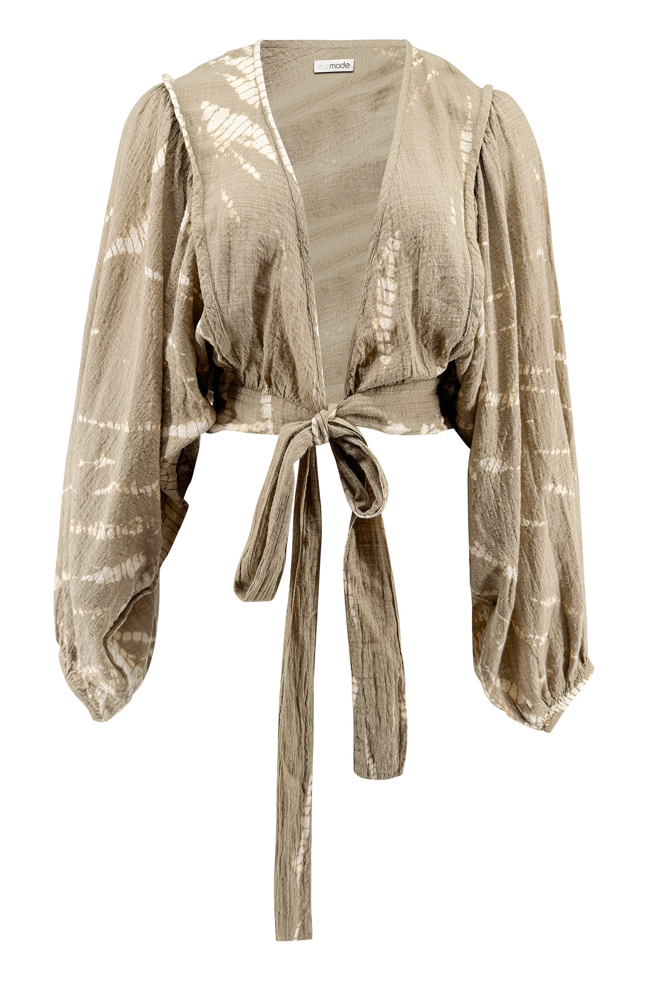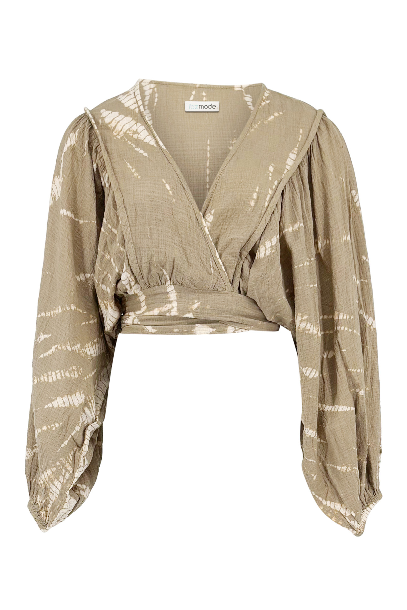 Wrap Top Alma Sera ingår i samlingen Sand Stories. Denna batiktopp är designad för sommardagar när komfort och stil möts. Det organiska batikfärgade mönstret i mjukt taupe och frisk elfenben skapar en lugn, lyxig look. Som ett resultat känns denna topp omedelbart naturlig och feminin.
