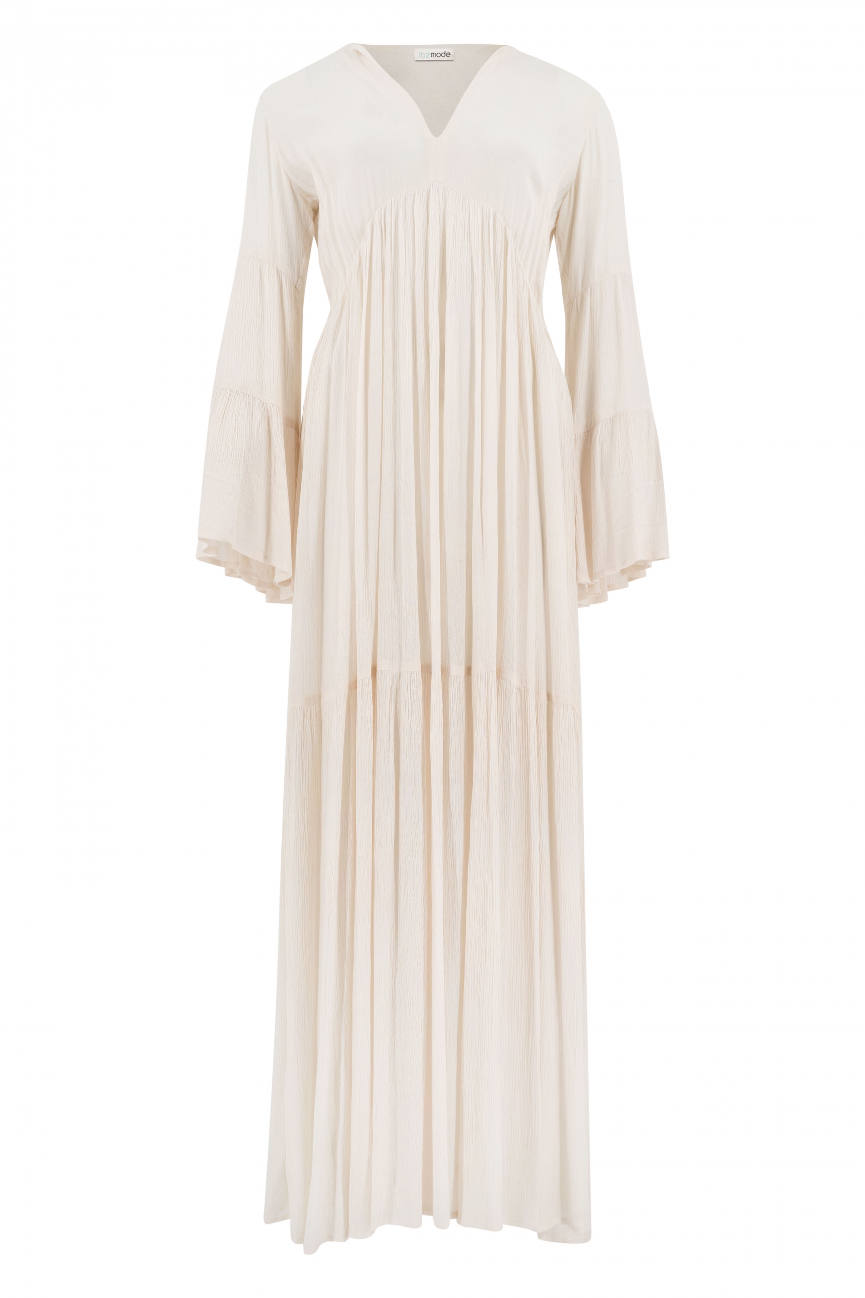 Skapa din ultimata sommarlook med Dress Lucia Ivory i en mjuk elfenbensnyans – en klänning som utstrålar både elegans och avslappnad boho-charm. Den djupa V-ringningen och de breda, utsvängda ärmarna ger en feminin och luftig silhuett som rör sig vackert med varje steg.