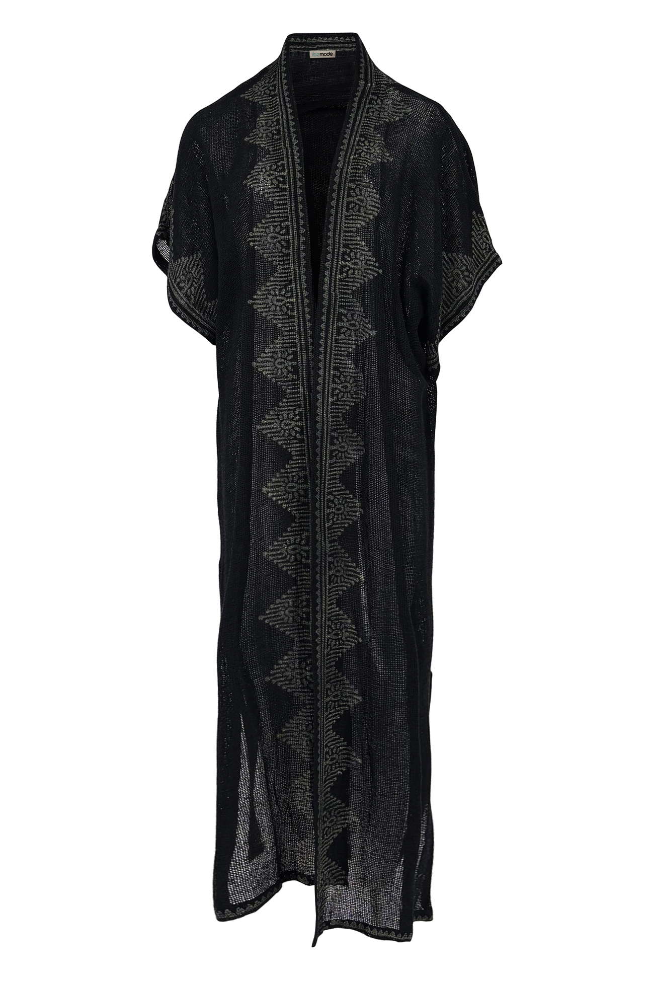 Kimonon faller upp och rör sig smidigt med dig. Detta skapar ett vackert flöde med varje steg. Kimonon har subtil stämpel med ett tyst tryck i ärmens ändar och vid kimonons öppning. Detta ger din resort-look en handgjord accent utan att det känns för livligt.