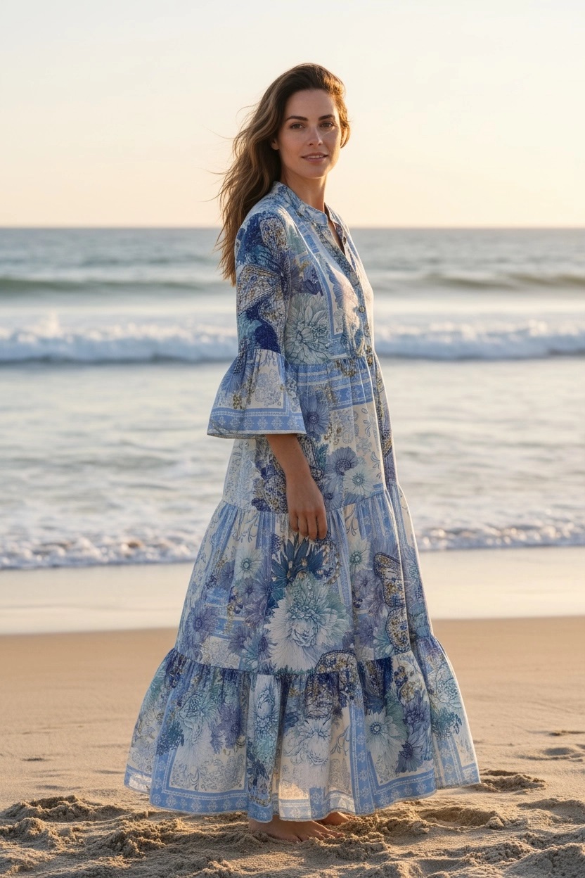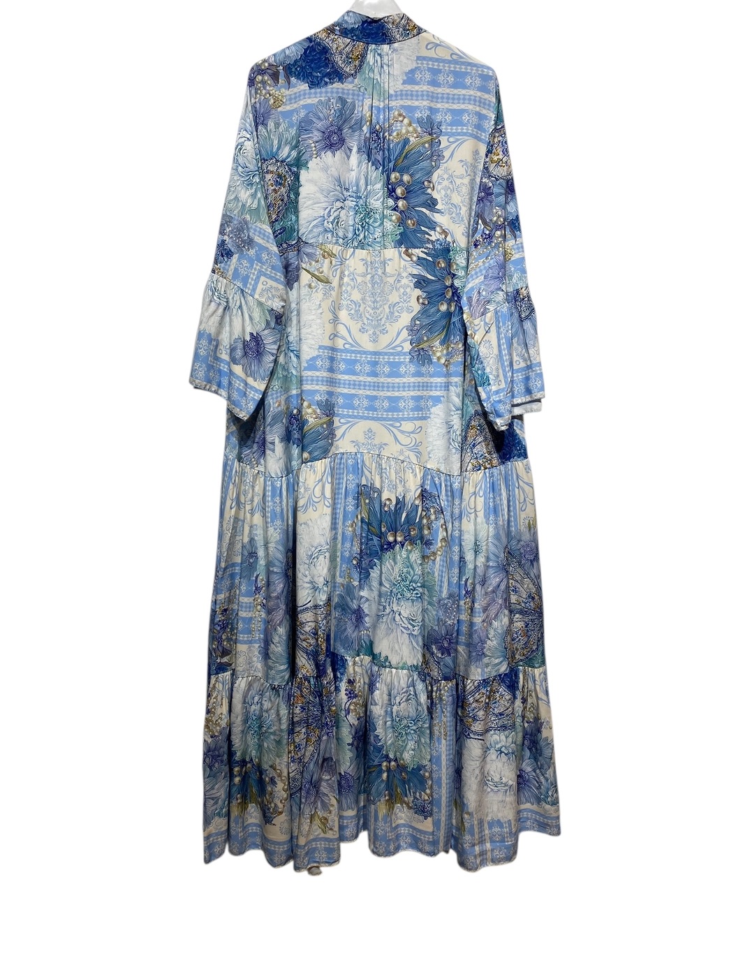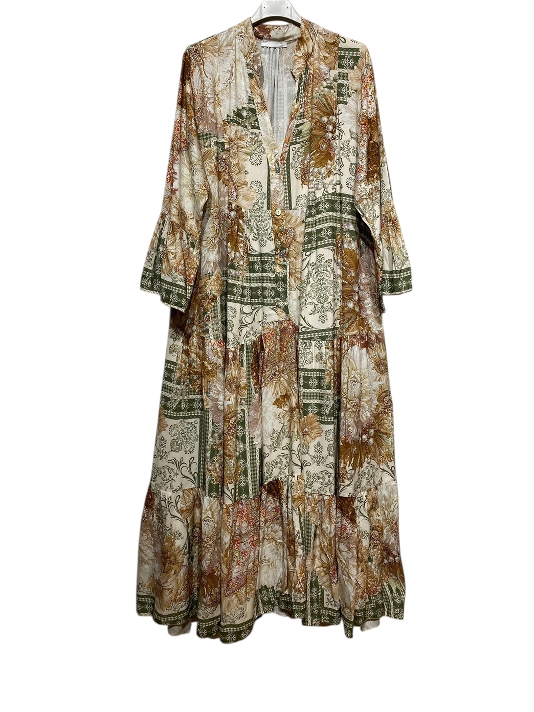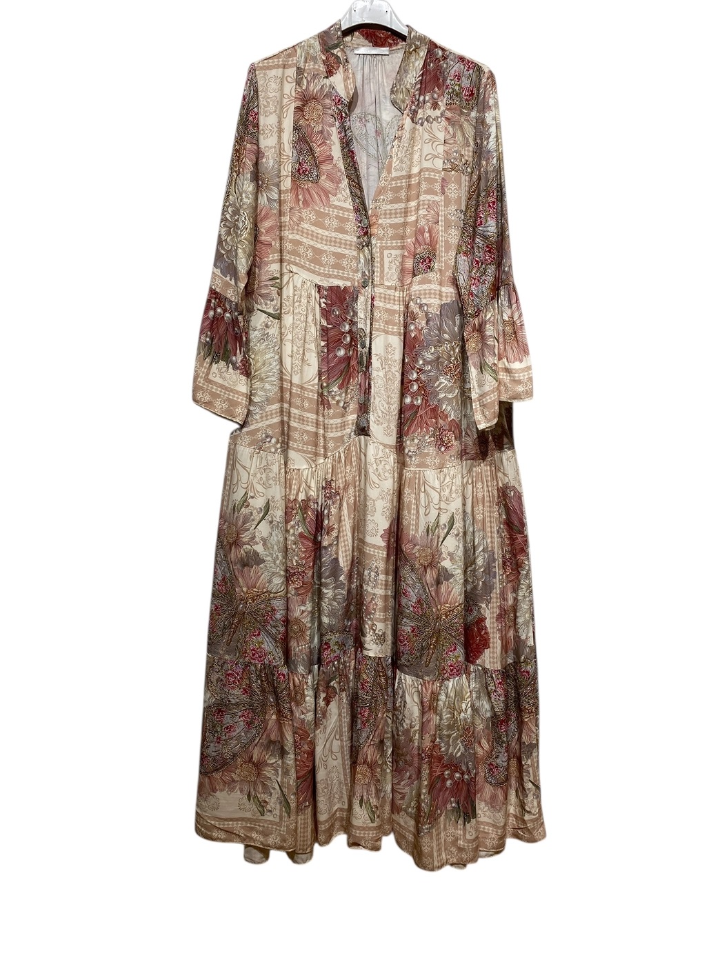Elegant lång klänning med v-ringad halsringning och dekorativa trumpetärmar som ger ett mjukt och feminint fall. Nederdelen skapar rörelse och en luftig känsla vid varje steg. En tidlös modell som passar både till vardag och festliga tillfällen. Välj mellan flera olika färger. Material viskos.
