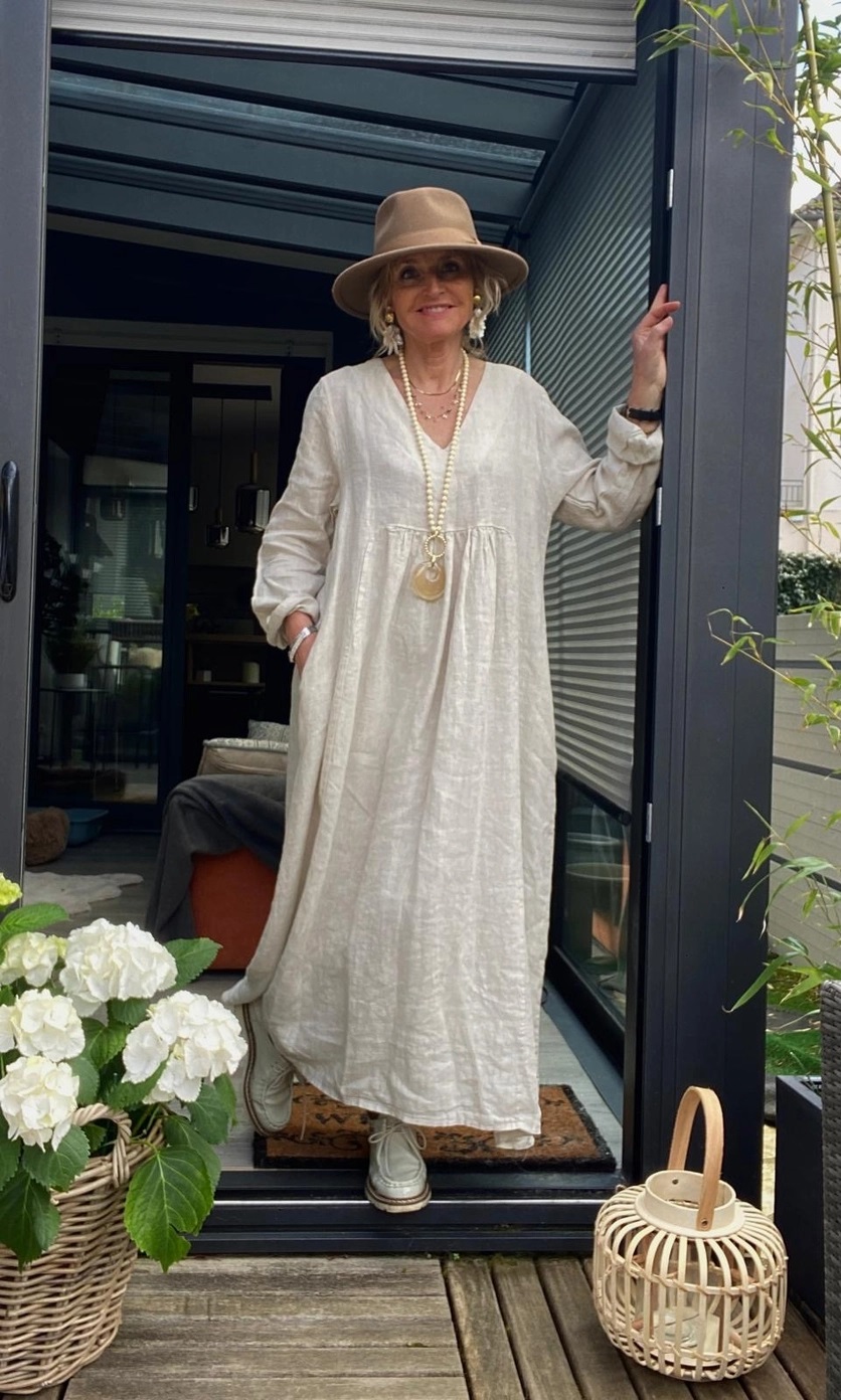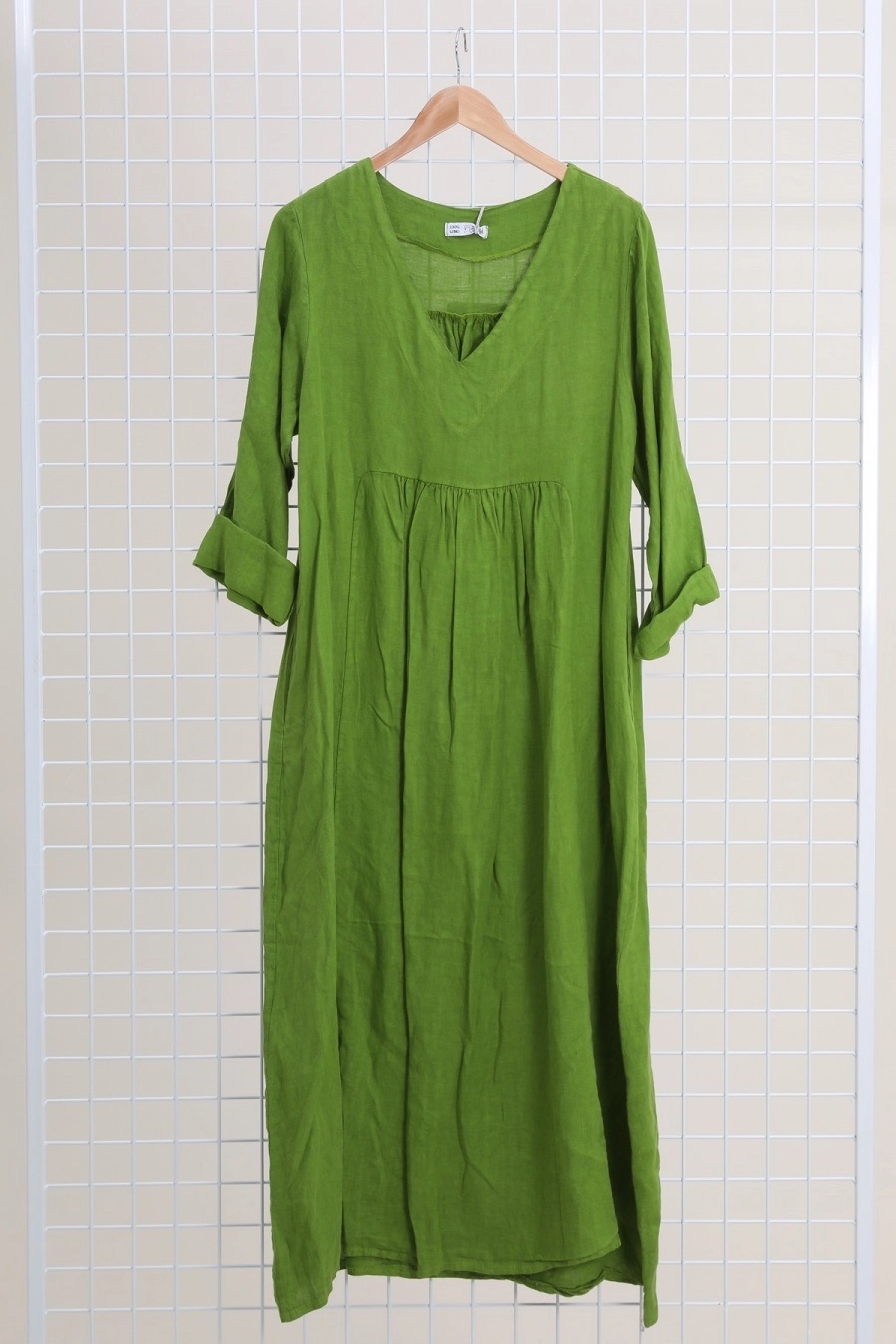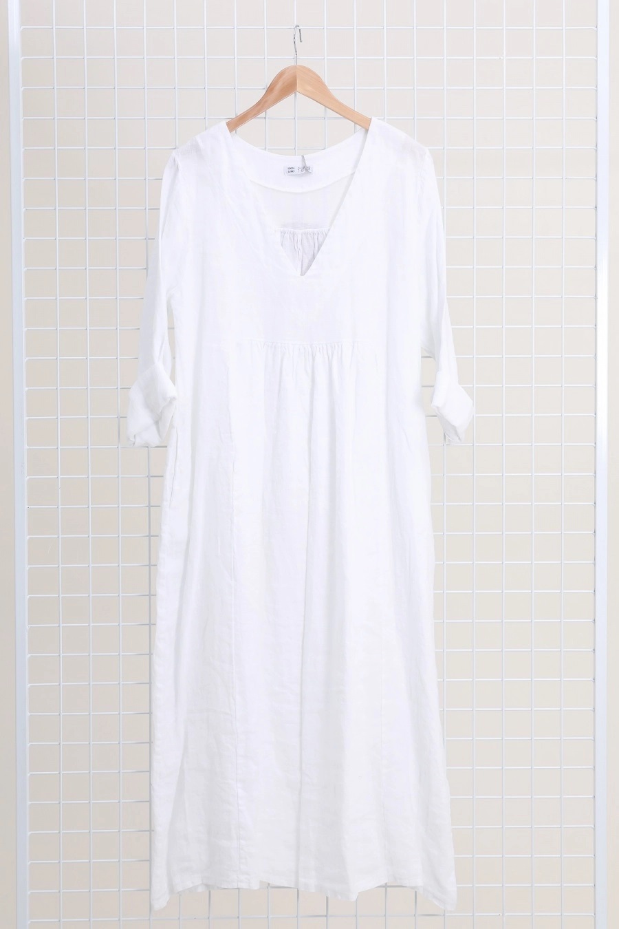 Linneklänning med V-ringning och rynkad detalj under bysten