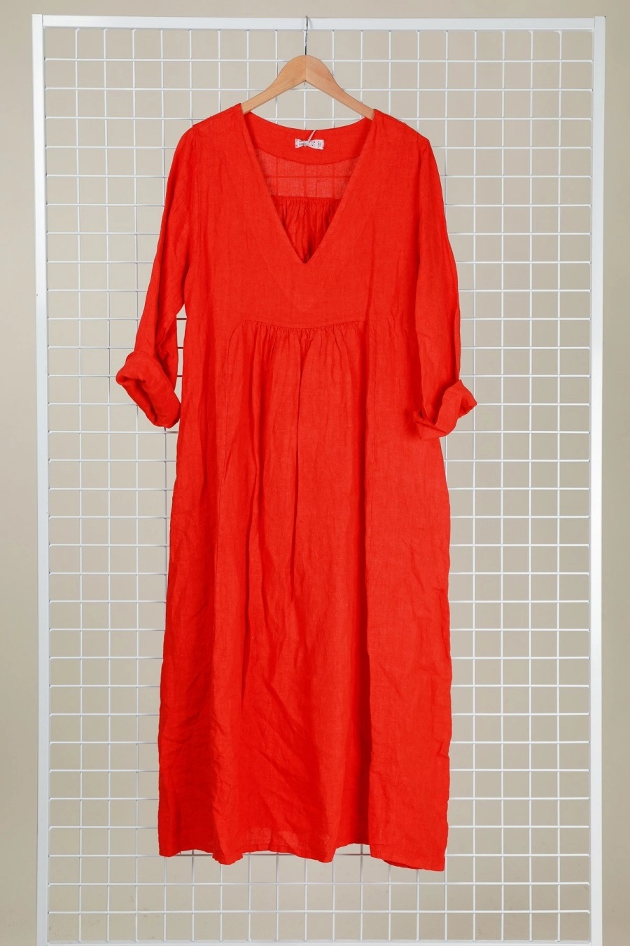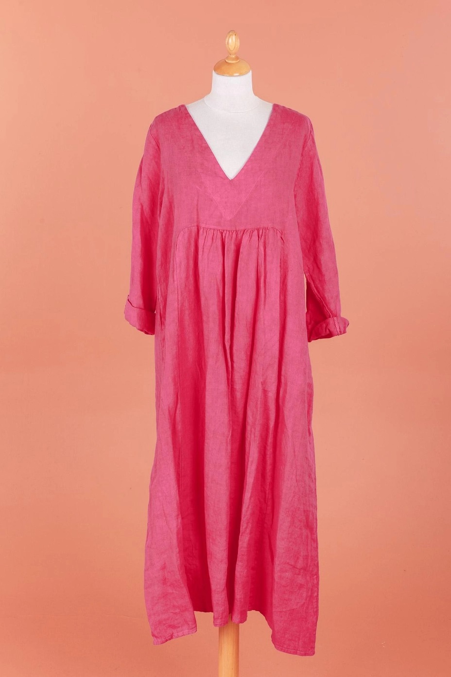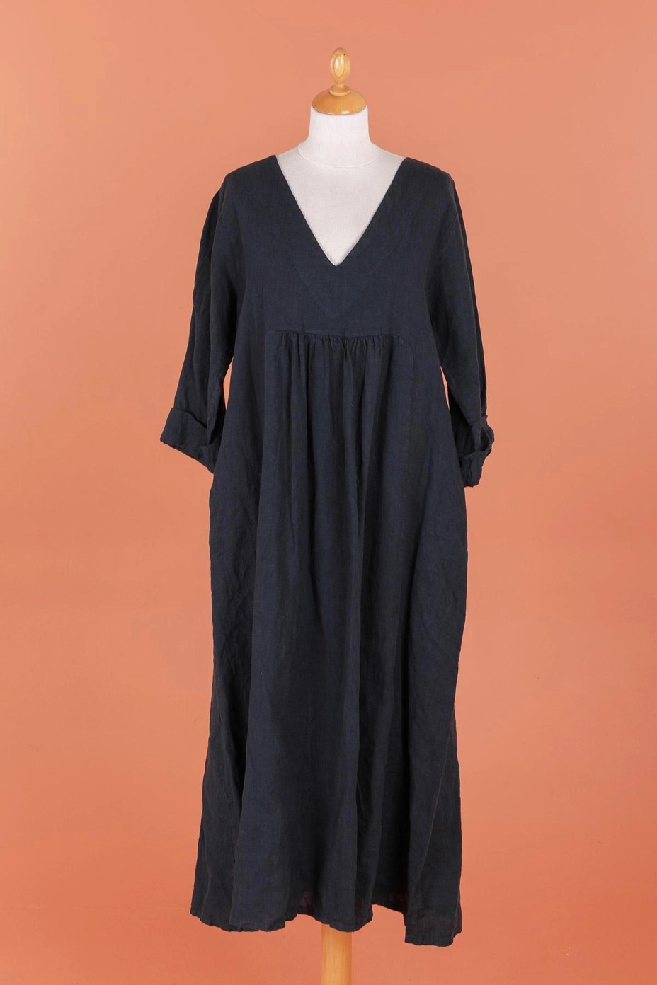 Denna stilrena linneklänning har en smickrande V-ringning och en vacker rynkning framtill precis under bysten som ger ett feminint fall. De långa ärmarna bidrar till en elegant silhuett samtidigt som det luftiga linnetyget gör klänningen bekväm och sval att bära. En tidlös modell som passar lika bra till vardag som till festligare tillfällen.