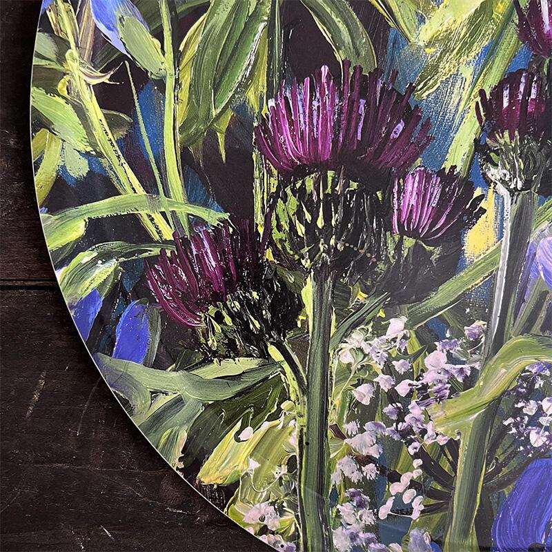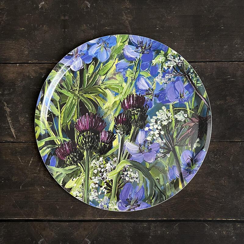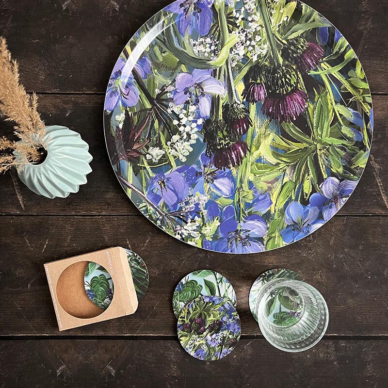 Elegant och tidlös rund bricka med vackert blommotiv av Anne Just. Perfekt för servering av kaffe, te och fika – eller som en dekorativ detalj i köket eller vardagsrummet.
