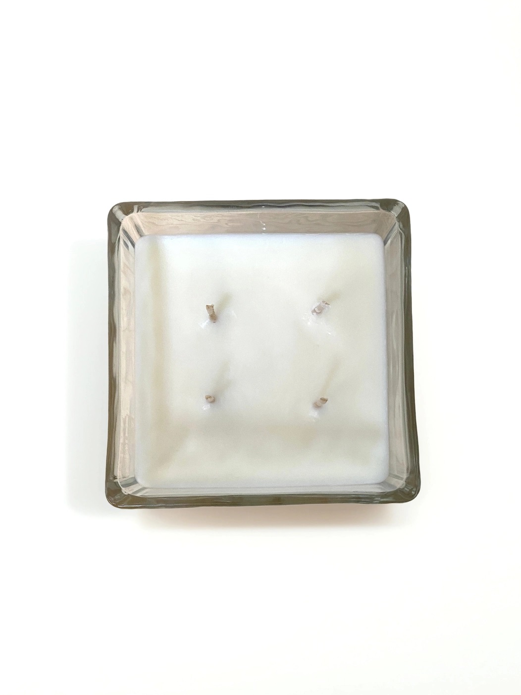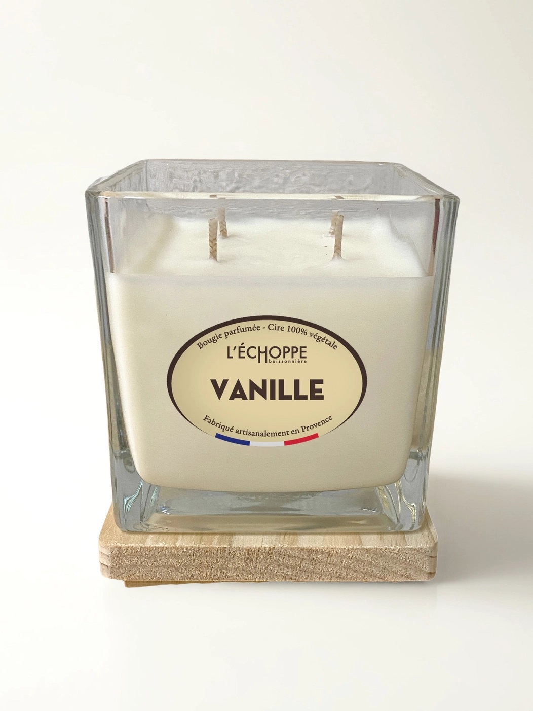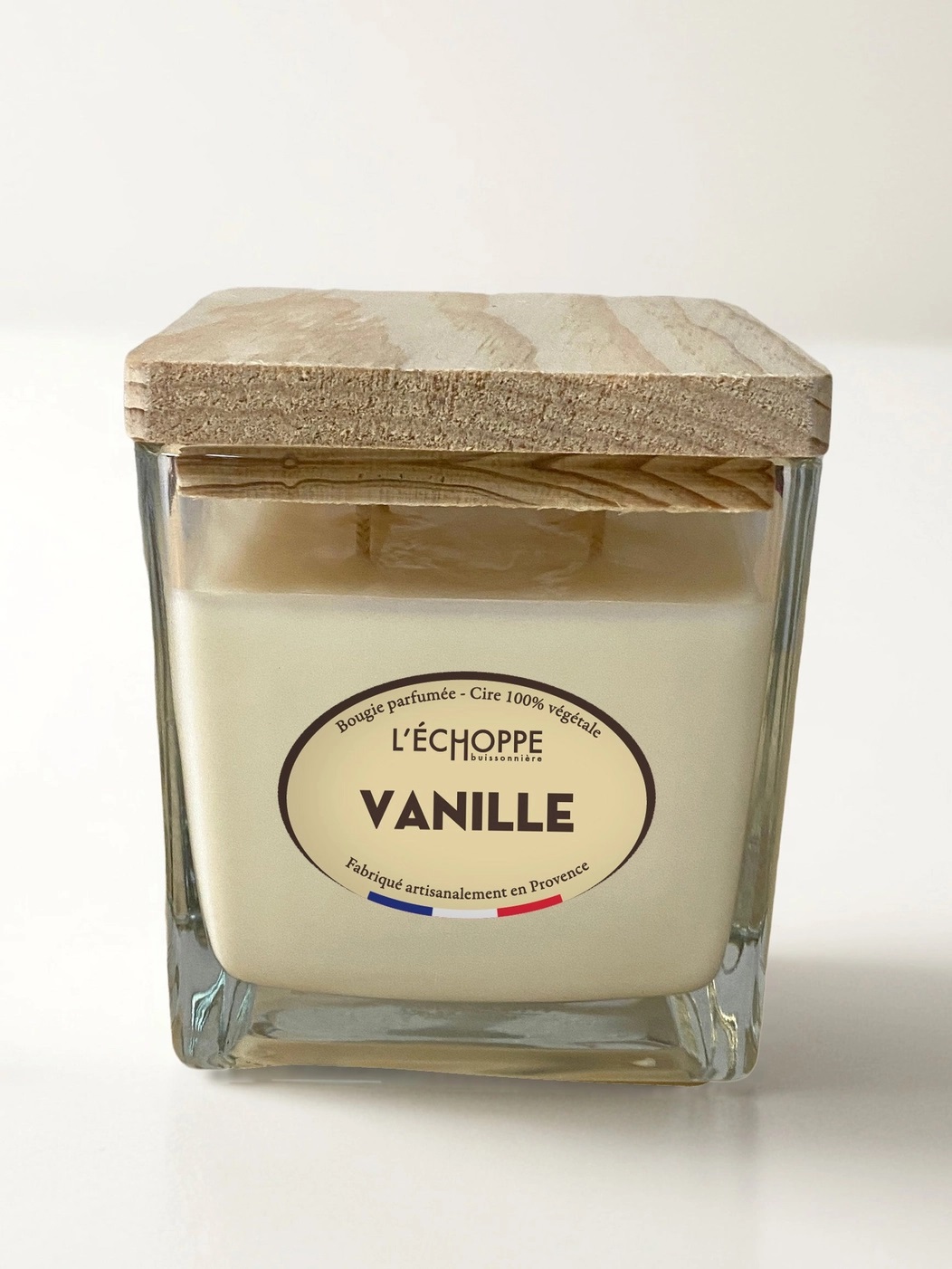 Den vackra kvadratiska glasburken med handgjort trälock – tillverkat i ett franskt E.S.A.T.* – gör detta ljus till ett stilfullt inslag i ditt hem, både tänt och som dekoration.