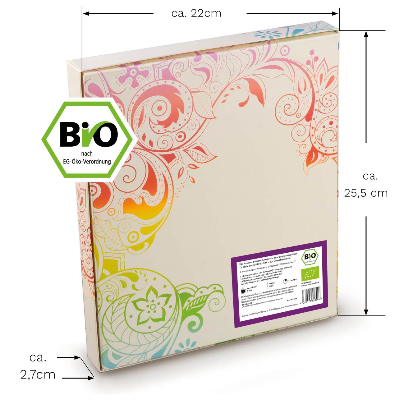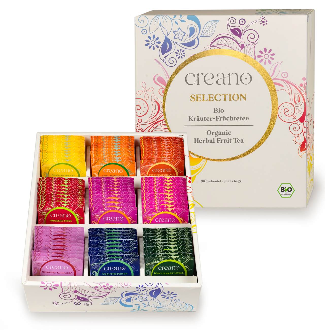 Creano ekologiskt örtte med frukt och kryddor är ett unikt present set med nio olika sorters ekologiska teer: Jordgubb och mynta, röda frukter, soliga örter, hallon och echinacea, örtblandning, bär och brännässla, ananas och lime, äpple och mandarin samt fruktig apelsin.