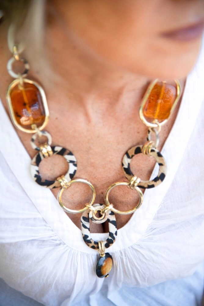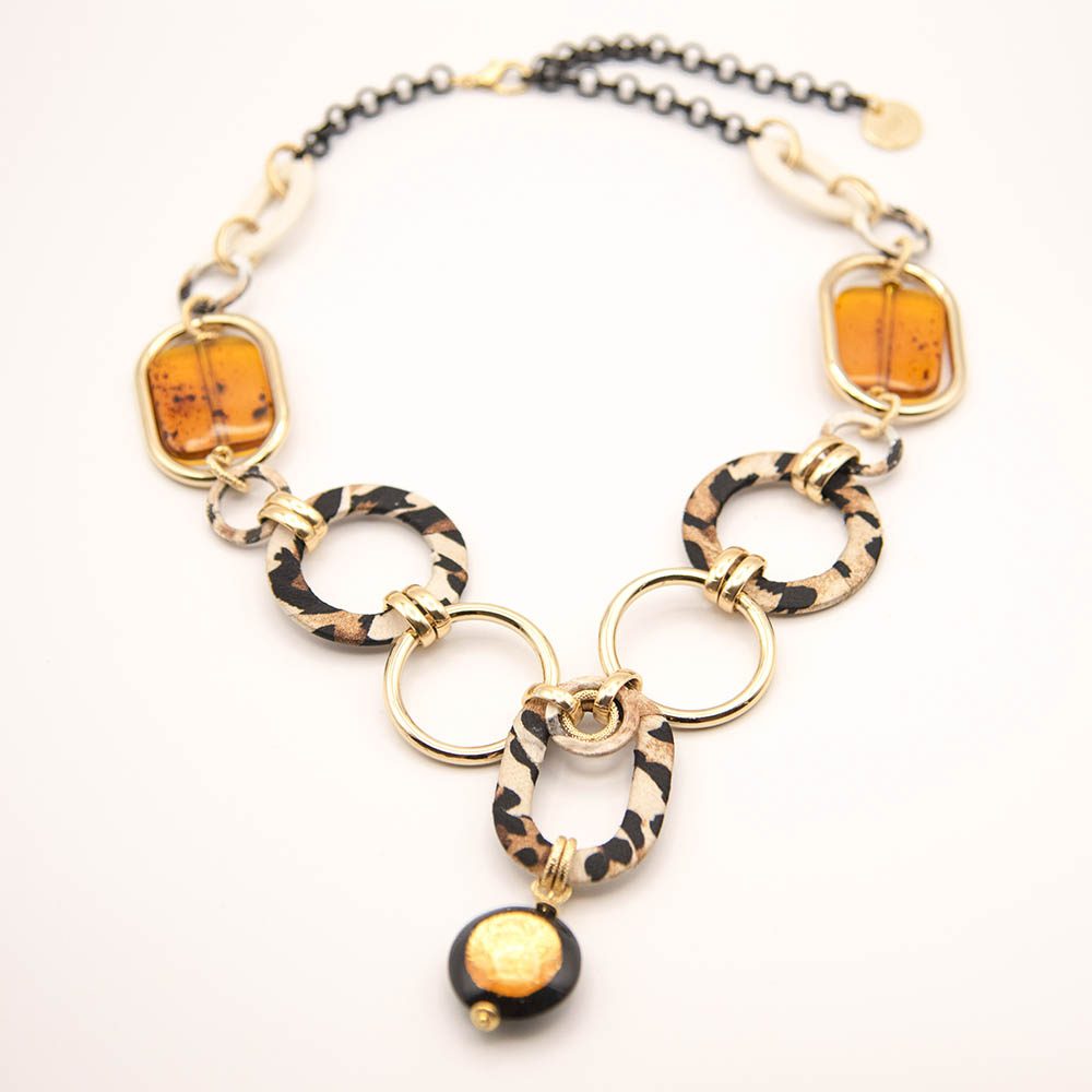Denna exklusiva choker kombinerar modern design med sofistikerad elegans. Smycket är tillverkat av runda och ovala guldfärgade aluminiumringar, dekorerade med bärnstensfärgade hartstabletter av hög kvalitet, fläckigt siden samt krämfärgade och svarta guldhartsdetaljer. Resultatet är ett unikt halsband som fångar ljuset och ger en varm, lyxig lyster.