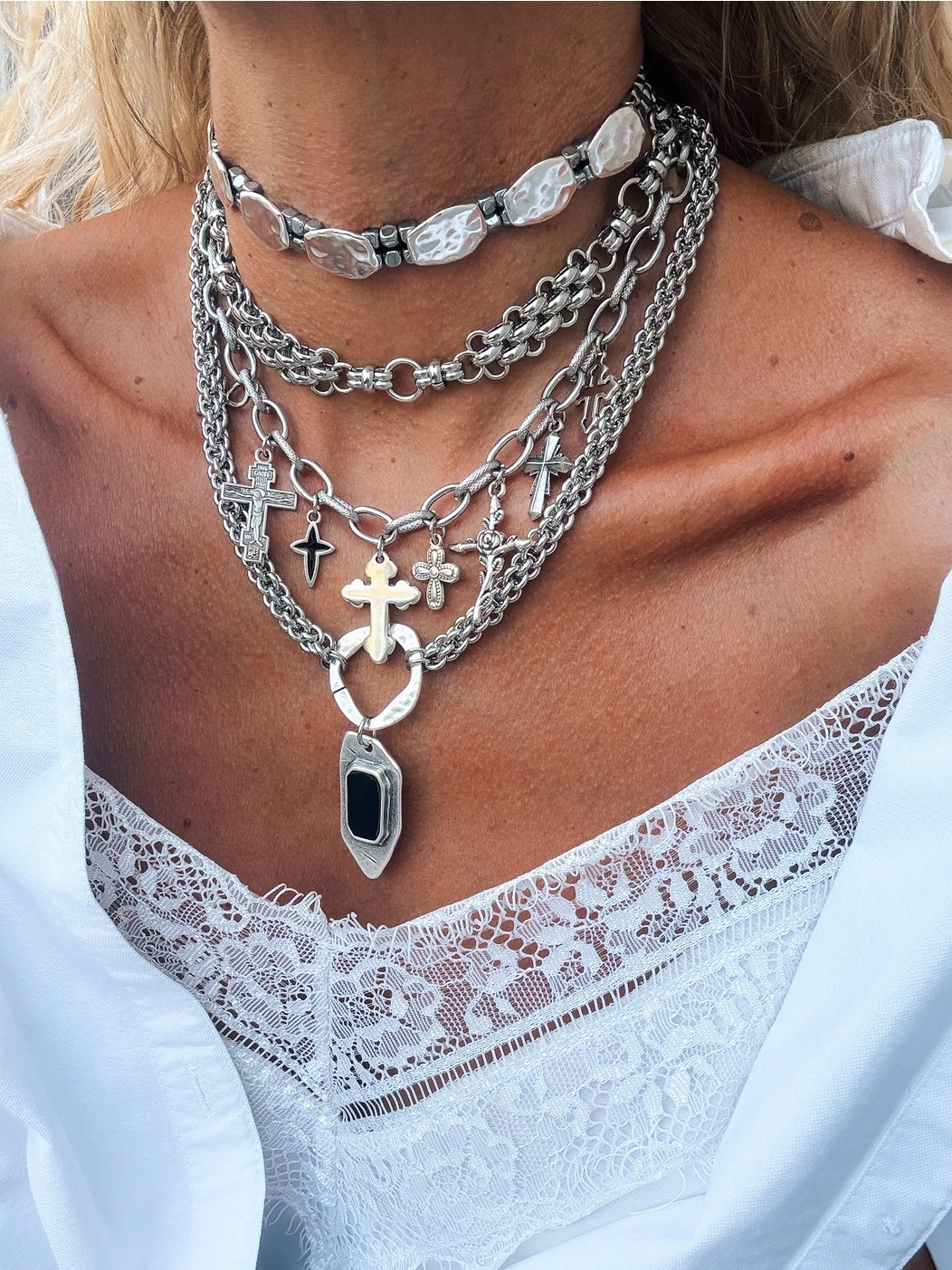 Fyra individuella halsband i en sofistikerad silverton, med kraftiga kedjor, korsberlocker och ett djärvt hänge med svarta emaljdetaljer. Skapa en slående lager-på-lager-look genom att bära dem tillsammans, eller bär varje halsband separat för en mångsidig, rock-chic touch i vardagen.