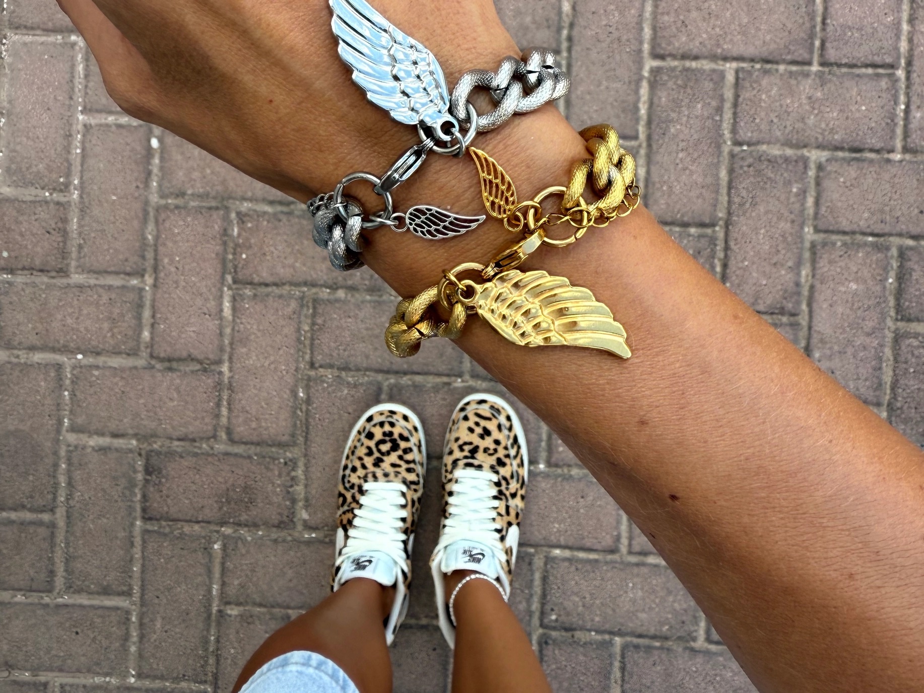 Sprid dina stilvingar! Detta kraftiga kedjearmband med en djärv vingberlock finns i silver eller guld — det perfekta statement-smycket för lager-på-lager eller att bära ensam.
