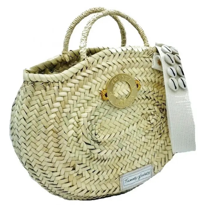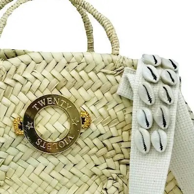 * 2 korta handtag fodrade (del) i läder och 1 långt handtag, på axelrem, i bomull med inlägg av små snäckskal.