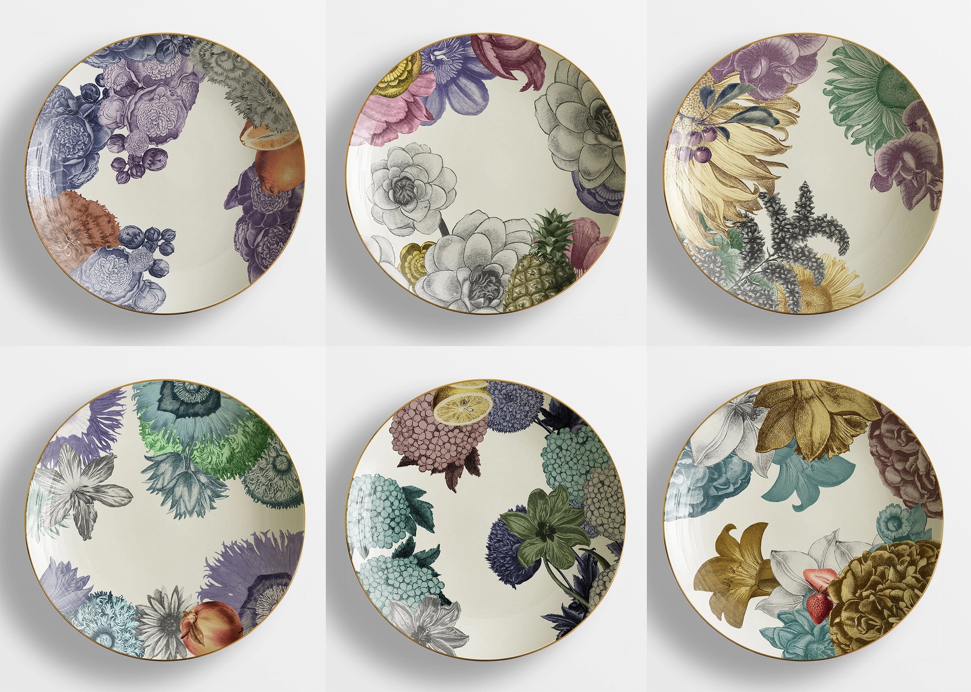 Kairo-samlingen det svarta och vita av dessa linjeporträtt kontrasterar elegant med mängden färgglada blommor och frukter som omger och omfamnar motivet. En hängivenhet av kärlek till den kvinnliga världen med dess fasetter och kontraster, blommans delikatess, designens kraft. Denna färgglada och mångsidiga uppsättning berikar och dekorerar alla typer av bord och är också väl lämpad för att bli en möbel på en vägg.